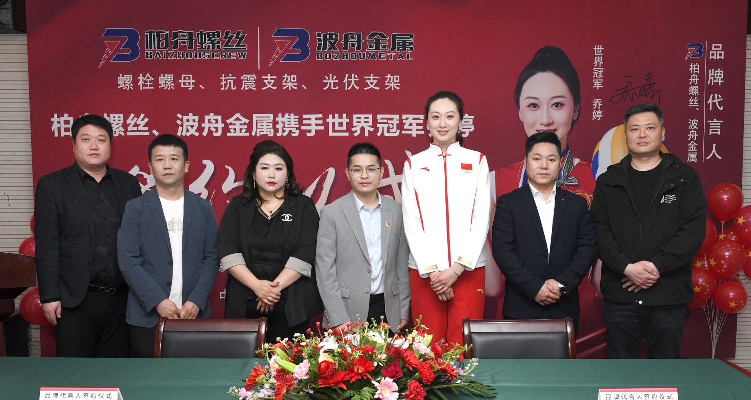 河北柏舟緊固件制造有限公司攜手女排世界冠軍喬婷在石家莊一江大廈22樓柏舟公司石家莊總部舉行《品牌代言人簽約活動(dòng)》。參觀(guān)過(guò)程中 總經(jīng)理賈天華先生向女排世界冠軍喬婷一行介紹了柏舟公司的相關(guān)產(chǎn)品和業(yè)務(wù)模式。 賈天華先生、喬婷老師分別對(duì)此次簽約活動(dòng)發(fā)表了講話(huà),隨后雙方入座正式在簽約本上簽字并合影留念!柏舟公司是業(yè)內(nèi)頭部品牌,也是行業(yè)內(nèi)首家和世界冠軍簽約代言的企業(yè)!