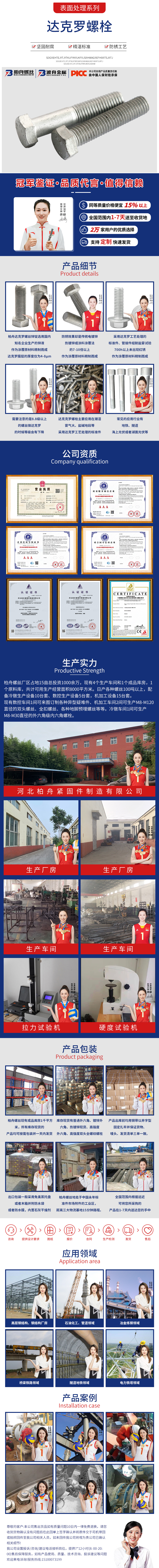 產(chǎn)品介紹: 柏舟達(dá)克羅螺絲鋅錠選用國(guó)內(nèi)知名企業(yè)生產(chǎn)的鋅液作為涂覆原材料精制而成,達(dá)克羅膜層的厚度僅為4-8μm,但其防銹效果卻是傳統(tǒng)電鍍鋅、熱鍍鋅或涂料涂覆法的7-10倍以上。采用達(dá)克羅工藝處理的標(biāo)準(zhǔn)件、管接件經(jīng)耐鹽霧試驗(yàn)700h以上未出現(xiàn)紅銹。達(dá)克羅表面優(yōu)點(diǎn)是做鹽霧試驗(yàn)可以達(dá)到小時(shí)最長(zhǎng)的一種表面處理。