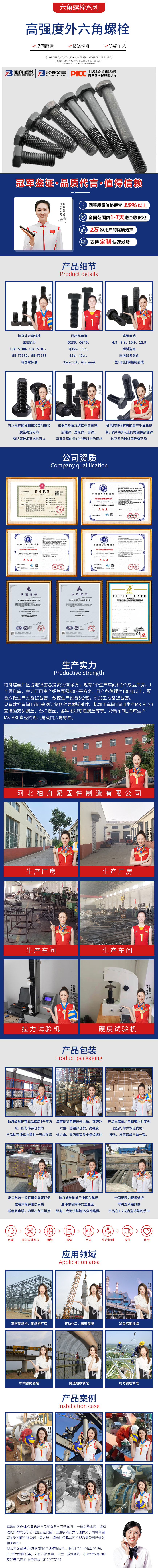 產品介紹: 柏舟外六角螺栓主要執(zhí)行GB-T5780、GB-T5781、GB-T5782、GB-T5783等國家標準。原材料可選Q235、Q345、Q355、35 、45 、40cr、35crmoA、42crmoA,等級可選4 8、8 8、10 9、12 9。鋼材選用國內知名鋼企生產的圓鋼精制而成,可以生產國標粗扣和英制細扣,質量穩(wěn)定可靠。有防腐技術要求的可以根據自身情況選擇電鍍白鋅、熱鍍鋅、達克羅、滲鋅,外六角使用范圍是標準件里面最廣泛的。
