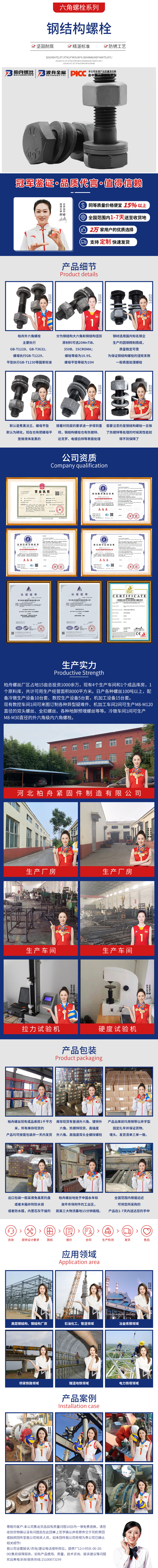 產(chǎn)品介紹:柏舟外六角螺栓主要執(zhí)行GB-T1228、GB-T3632、螺母執(zhí)行GB-T1229、平墊執(zhí)行GB-T1230等國家標(biāo)準(zhǔn)。分為鋼結(jié)構(gòu)大六角和鋼結(jié)構(gòu)扭剪,原材料可選20MnTiB、35VB、35CROMA;螺栓等級為10 9S、螺母平墊等級為10H。鋼材選用國內(nèi)知名鋼企生產(chǎn)的圓鋼精制而成,質(zhì)量穩(wěn)定可靠。為保證鋼結(jié)構(gòu)螺栓的扭矩系數(shù)一般表面處理螺栓默認(rèn)是煮黑法蘭、螺母平墊默認(rèn)為磷化。