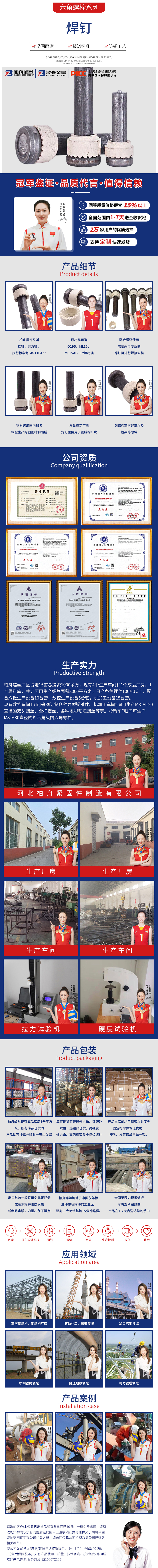 產(chǎn)品介紹:柏舟焊釘又叫栓釘、剪力釘、執(zhí)行標準為GB-T10433、原材料可選Q195、ML15、ML15AL、LY等材質(zhì)。配合磁環(huán)使用,需要采用專業(yè)的焊釘機進行焊接安裝。鋼材選用國內(nèi)知名鋼企生產(chǎn)的圓鋼精制而成,質(zhì)量穩(wěn)定可靠。焊釘主要用于鋼結(jié)構(gòu)廠房,鋼結(jié)構(gòu)高層建筑以及橋梁等領(lǐng)域。
