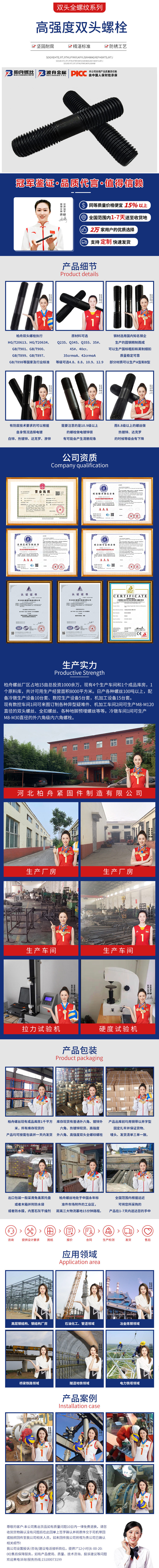 產品介紹:柏舟雙頭螺栓執(zhí)行HG T20613、HG T20634、GB T901、GB T900、GB T899、GB T897、GB T898等國家及行業(yè)標準。原材料可選Q235、Q345、Q355、35 、45 、40cr、35crmoA、42crmoA,等級可選4 8、8 8、10 9、12 9。鋼材選用國內知名鋼企生產的圓鋼精制而成,可以生產國標粗扣和英制細扣,質量穩(wěn)定可靠,部分材質可以生產A型和B型。有防腐技術要求的可以根據自身情況選擇電鍍白鋅。