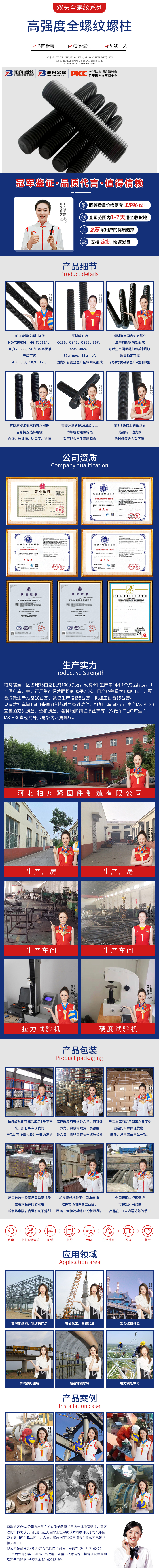 產(chǎn)品介紹:柏舟全螺紋螺柱執(zhí)行HG T20634、HG T20614、HG T20635、SH T3404等行業(yè)標(biāo)準(zhǔn)。原材料可選Q235、Q345、Q355、35 、45 、40cr、35crmoA、42crmoA,等級(jí)可選4 8、8 8、10 9、12 9。鋼材選用國(guó)內(nèi)知名鋼企生產(chǎn)的圓鋼精制而成,可以生產(chǎn)國(guó)標(biāo)粗扣和英制細(xì)扣,質(zhì)量穩(wěn)定可靠,部分材質(zhì)可以生產(chǎn)A型和B型。有防腐技術(shù)要求的可以根據(jù)自身情況選擇電鍍白鋅、熱鍍鋅、達(dá)克羅、滲鋅。需要注意的是10 9級(jí)以上。