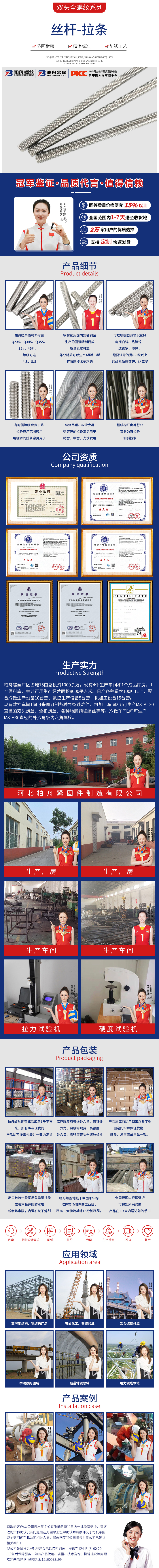 產(chǎn)品介紹:柏舟拉條原材料可選Q235、Q345、Q355、35 、45 ,等級可選4 8、8 8。鋼材選用國內(nèi)知名鋼企生產(chǎn)的圓鋼精制而成,質(zhì)量穩(wěn)定可靠,部分材質(zhì)可以生產(chǎn)A型和B型。有防腐技術(shù)要求的可以根據(jù)自身情況選擇電鍍白鋅、熱鍍鋅、達克羅、滲鋅,需要注意的是8 8級以上的螺絲做熱鍍鋅、達克羅的時候等級會有一定的下降。拉條應(yīng)用范圍較廣,電鍍鋅的拉條常見用于裝修吊頂、農(nóng)業(yè)大棚。