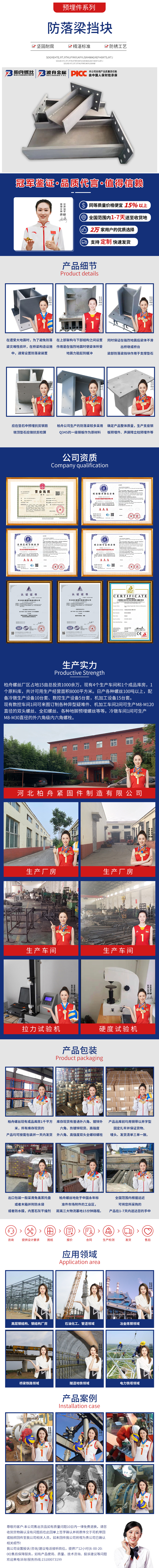 產(chǎn)品介紹:柏舟公司生產(chǎn)的防落梁較多采用Q345的一級鋼板作為原材料以確定產(chǎn)品的整體質(zhì)量??缮a(chǎn)支座鋼板預(yù)埋件、聲屏障立柱預(yù)埋件、接觸網(wǎng)預(yù)埋件、固定墩等相關(guān)產(chǎn)品。較多采用多元合金共滲+鈍化+封閉和熱鍍鋅的表面防腐處理工藝,熱鍍鋅鋅層厚度可達(dá)80um以上。防落梁擋塊的概述: 在遭受大地震時,為了避免防落梁災(zāi)難性損壞,在橋梁構(gòu)造設(shè)施中,通常設(shè)置防落梁裝置。