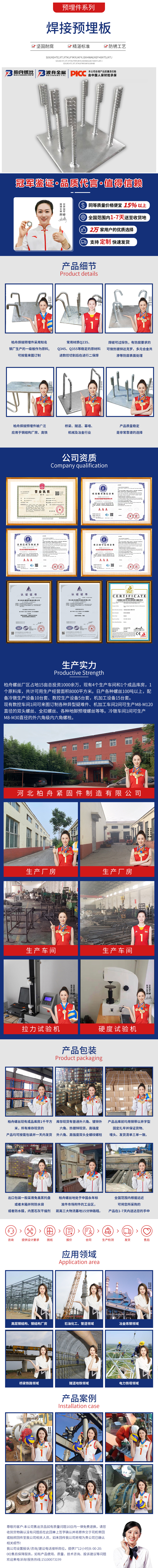 產(chǎn)品介紹:柏舟焊接預(yù)埋件采用知名鋼廠生產(chǎn)的一級(jí)板作為原料,可按需來(lái)圖訂制。常用材質(zhì)Q235、Q345、Q355等穩(wěn)定的原材料進(jìn)數(shù)控切割后在進(jìn)行二保焊,焊縫可過(guò)探傷。有防腐要求的可做熱鍍鋅、達(dá)克羅、多元合金共滲等防腐表面處理。柏舟焊接預(yù)埋件被廣泛應(yīng)用于鋼結(jié)構(gòu)廠房、高鐵、橋梁、隧道、幕墻、機(jī)械及冶金行業(yè),質(zhì)量穩(wěn)定靠譜選擇。
